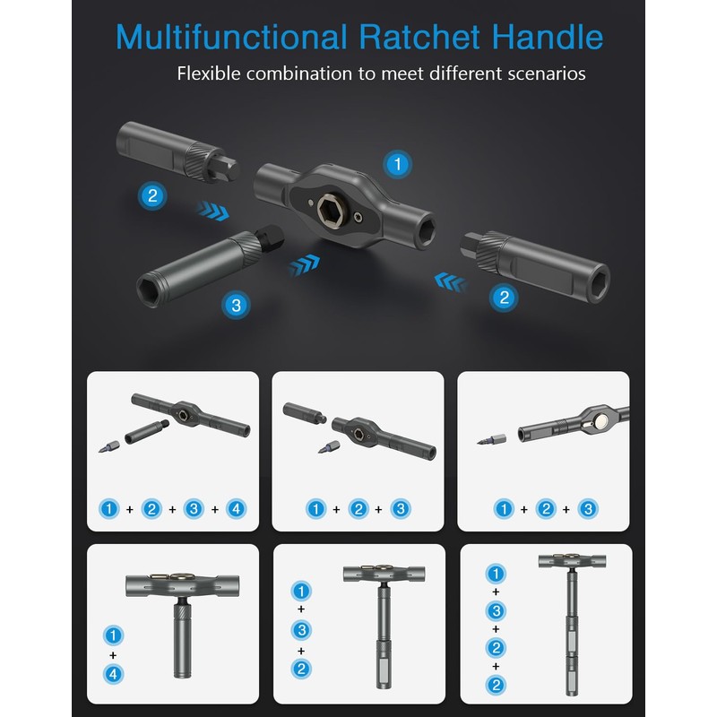 - 【Flexible Aluminum Alloy Handle】Ratchet screwdriver features a detachable ergonomic aluminum alloy handle is lightweight yet rugged, crafted from hot-forged aluminum alloy with high-precision CNC molding for durability and oxidation resistance