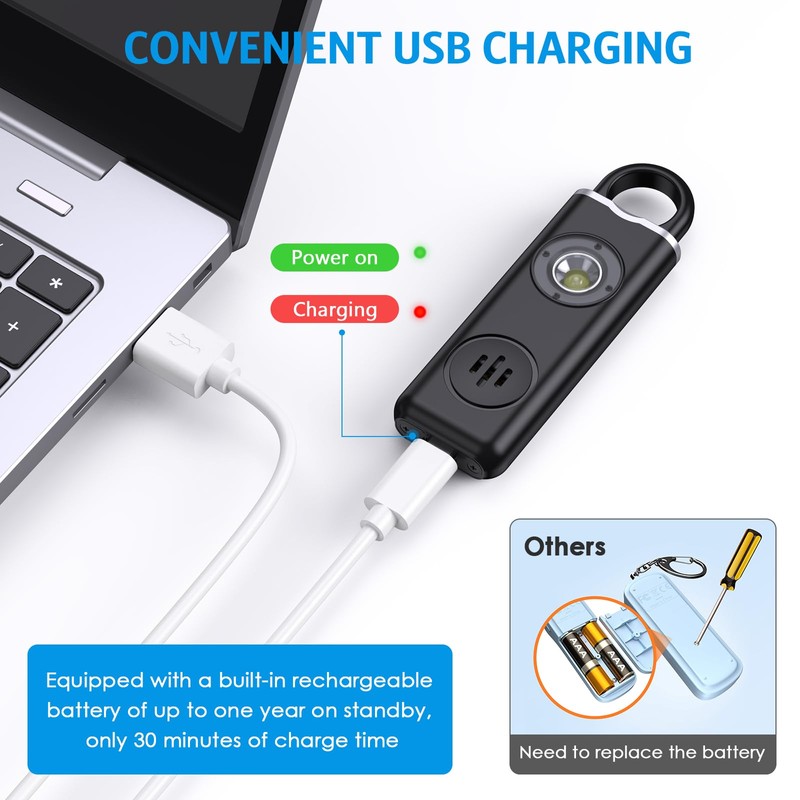 - 【Convenient USB Charging】Worried about battery? Don't be! This emergency alarms comes with a USB cable. Charge it in just 30 minutes, and enjoy up to a year of standby time. Red light indicates charging; green when fully charged