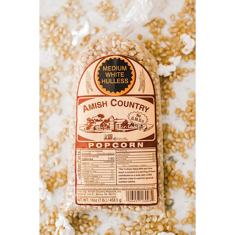 - 1 LB MEDIUM WHITE KERNALS - This delicious, gourmet popcorn is made in the heart of Amish country.