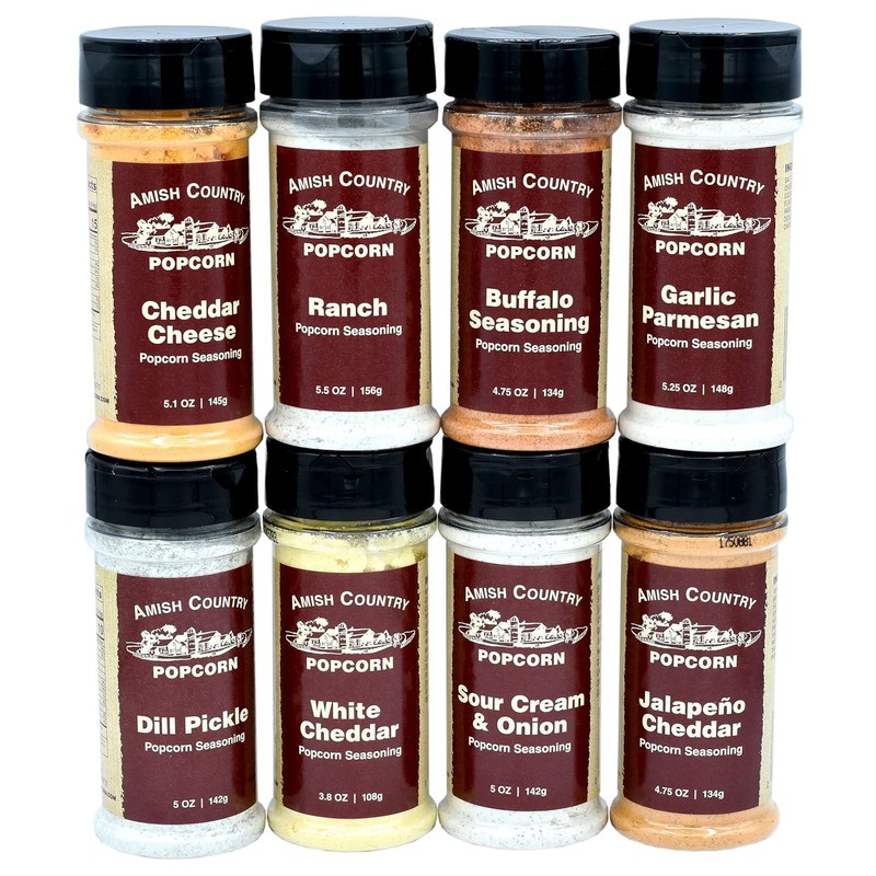 - 8 PACK SEASONING SAMPLER - Variety is the spice of life. Try all of our most popular seasonings on your Amish Country Popcorn. Each sampler includes Buffalo, Garlic Parmesan, Jalepeno Cheddar, Dill Pickle, Ranch, Cheddar, Sour Cream & Onion and White Cheddar. Try them alone or combine them, the possibilities are endless.