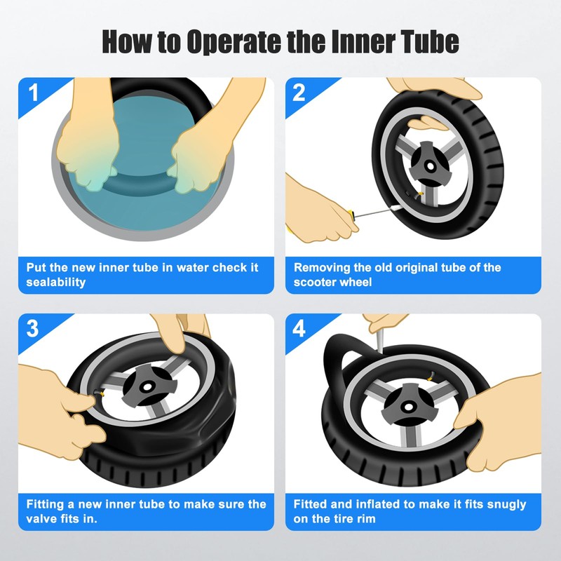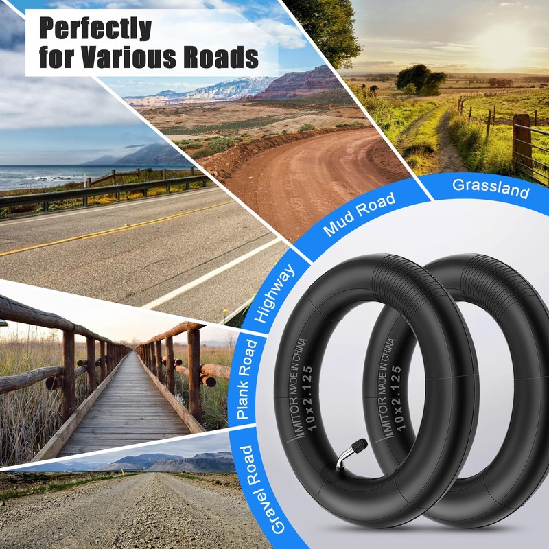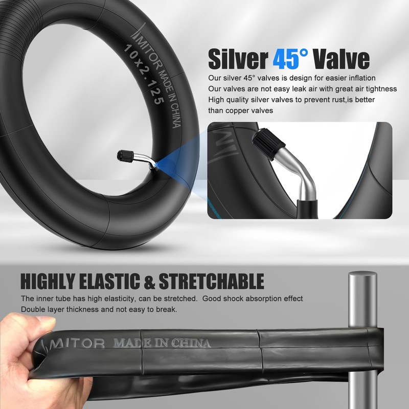 - Easy to Mount: Amitor 10" 10x2.125 scooter inner tube with valve 45° is designed to be user-friendly and can be easily mounted, so you'll be on the road in no time.The tires are flexible and the actual size of the it is bound to be smaller before it is mounted to the scooter hub, otherwise the tire will not fit tightly and will simply fall off the scooter hub.If you have any questions or you're not completely satisfied when you receive, just send us an email. We'll make it right.