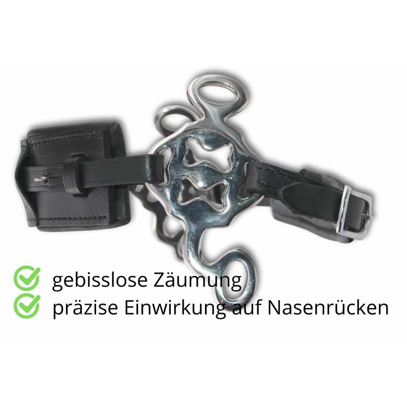 - Padded and adjustable leather nose strap and chin strap