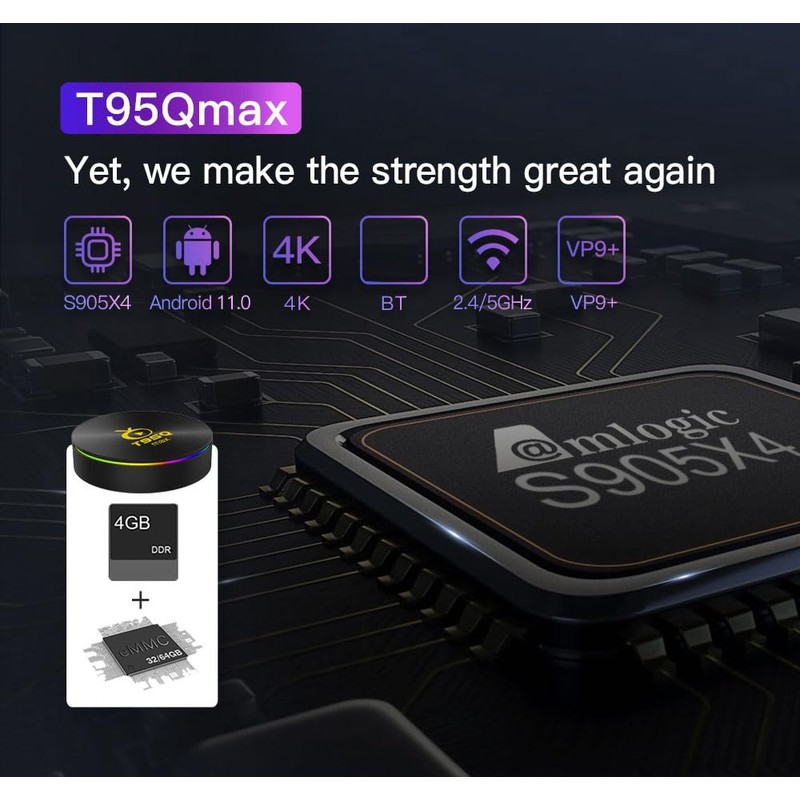 - Amlogic S905X4 Android 11.0 TV Box 4GB RAM 64GB ROM T95Q MAX TV Box S905X3 64-bit Quad Core with Dual Wi-Fi 2.4G/5.0G BT 4.0/ 3D Ultra HD 8K/ H.265/ 100M LAN/USB 3.0 Android TV Box