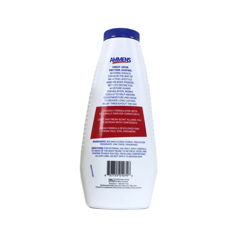 Product DescriptionAmmens Original 100% Talc Medicated Powder is specially formulated with a blend of zinc oxide and highly absorbent corn starch to help soothe skin while absorbing excess moisture. Use after bath or shower for all day dryness and silky-soft smoothnessFrom the ManufacturerAmmens Original Formula gives you All-Day Protection with a blend of pure, absorbent powder and natural zinc to relieve and soothe itchy skin.