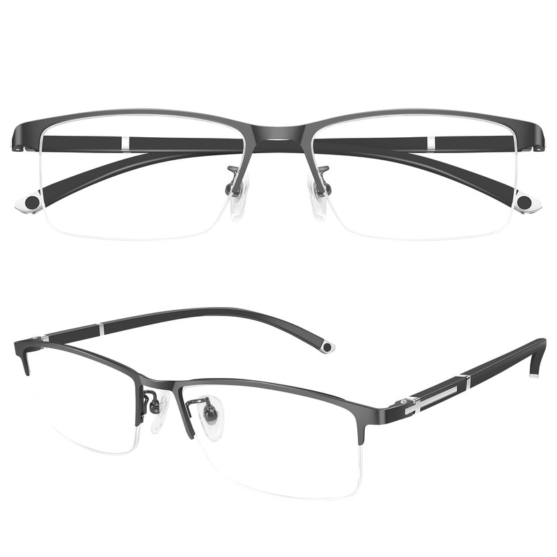 [AMMGLSS] 遠中近三用メガネ ブルーライトカット ユニセックスのハーフリム型メガネ 樹脂製レンズ チタン合金 メンズ レディース グレー 度数+1.5