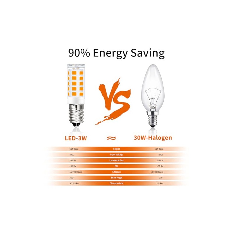 - ?90% EnergieeinsparungDiese Super Hell E14 led 3W 32LEDS hat eine Helligkeit von 345Lumen, Das entspricht 28W 30W 34W Glhlampe und Halogenlampen, arbeiten mit AC 220V 230V 240Volt. Sie ist besonders energieeffizient im Vergleich zu Glh- oder Halogenlampen,da sie nur minimale W?rme abgeben, Gro?artiger Ersatz, mit dem Sie 90% der Stromrechnung fr die Beleuchtung sparen k?nnen.