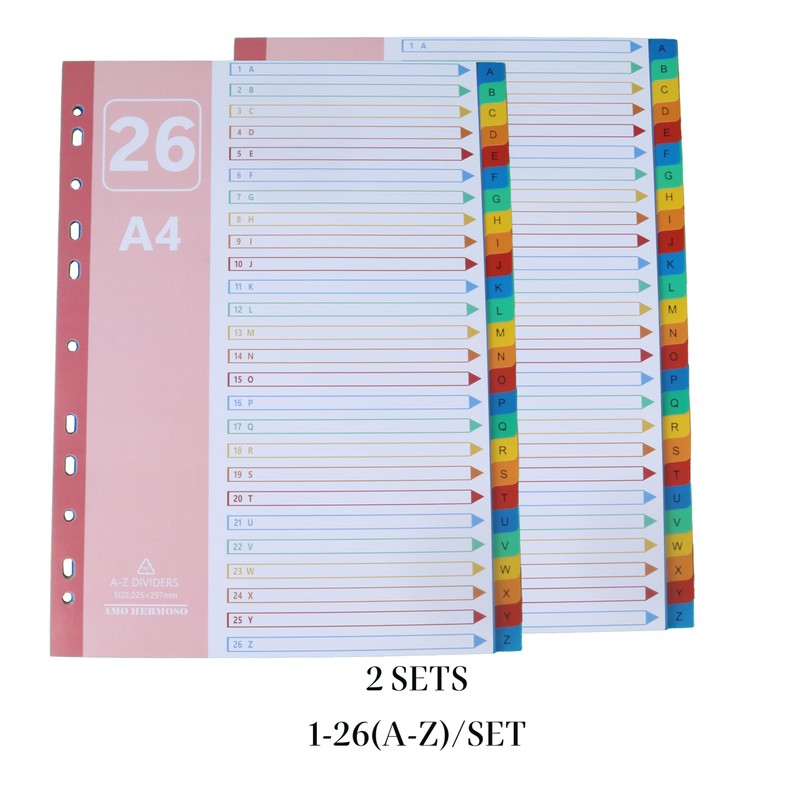 AMO HERMOSO 2 x 26-part index dividers for A4 folders, A-Z plastic index sheets 1-26 for school, office