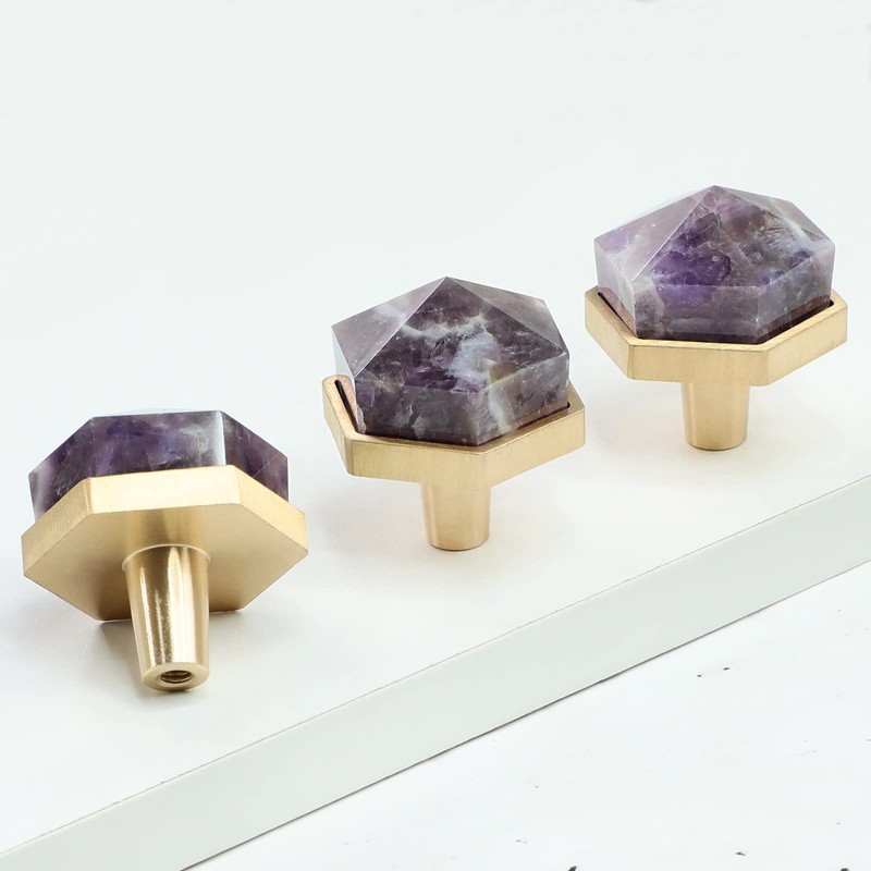 - Hand-Carved Hexagon Crystal Brass Knobs: Set of 2 hand-carved and polished faceted crystal knobs, made of amethyst and brushed brass, easy to grip and clean. Smooth surface and edge, offering you comfortable touch. The brushed brass handle is sturdy and durable. Since the pull knobs are made of crystal stone, please allow the variation of color, shape, and veins. Your order will be unique.
