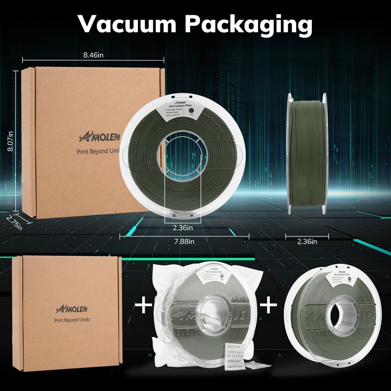 • 【Perfect Winding & Easy Printing】Using the latest intelligent winding machine and manual inspection guarantees each roll of PLA filament neat and tidy. AMOLEN high quality PLA-CF filament is tangle & clog free. Printing Temperature 190-220℃; Printing Bed (Optional) 0-60℃; Tips: Layer Height 0.15mm