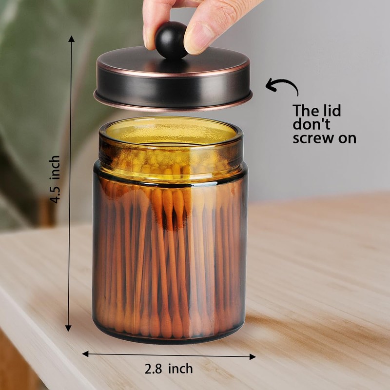 Amolliar Amber Glass Qtip Holder, Apothecary Jars with Oil Rubbed Bronze Metal Lid & Stickers-Bathroom Qtip Dispenser Storage Organizer Set,Vanity Counter Canister for Cotton Swabs,Round Floss(2 Pack)