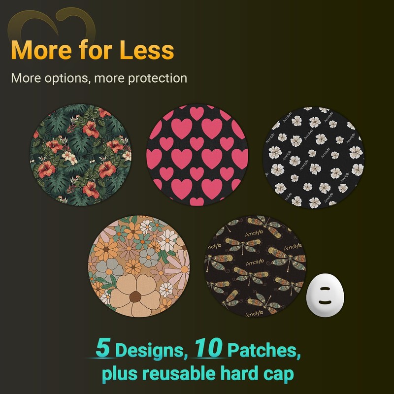 - Double the Value - Each pack offers 10 Dexcom G7 adhesive patches (5 unique designs with 2 pieces each) plus a reusable protective hard cap. More options, more protection, all for less.