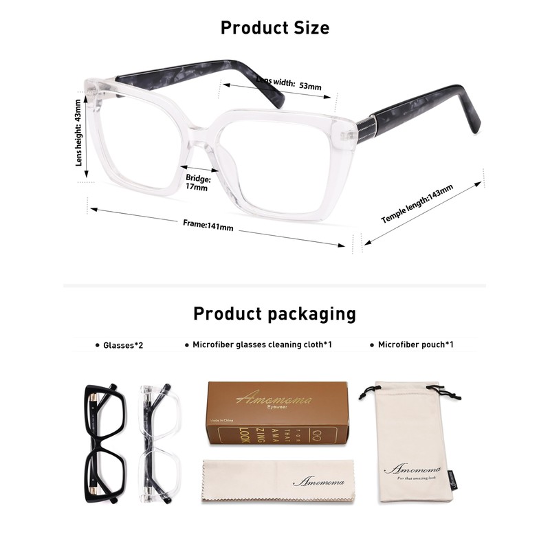 - PACKAGE –Blue light blocking reading glasses*2, microfiber glasses cleaning cloth*1, leather case*1, beautifully designed box*1