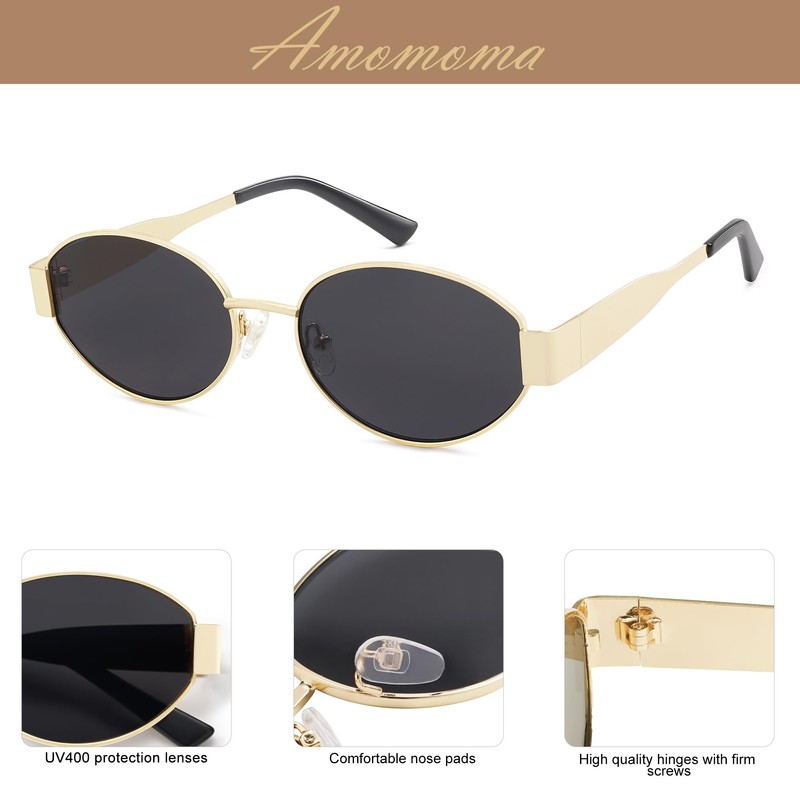 AMOMOMA Retro Oval Trendy Sunglasses for Women Designer 2024 Womens Sun Glasses Metal 90s AM6639C1+C3