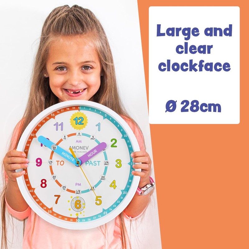 Amonev Time Teacher Clock (V4) Children's Clock, Easy to Read Analogue Clock with Silent Ticking. Teach Children How to Tell the Time - Multicolour