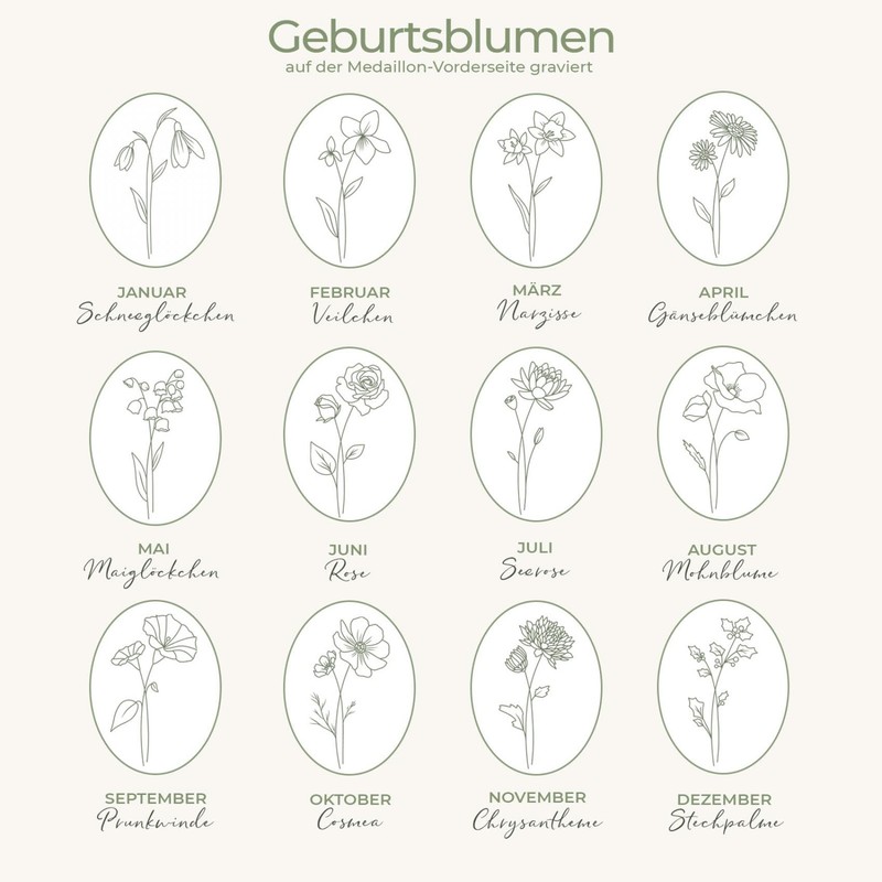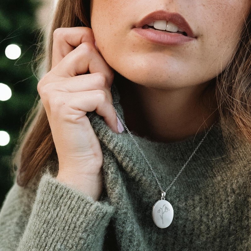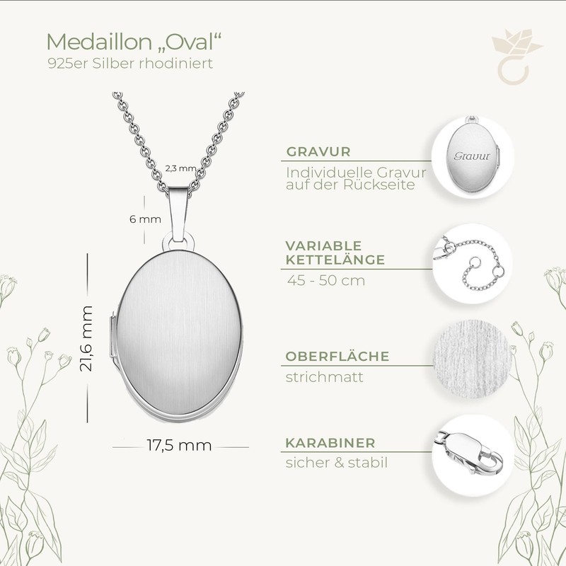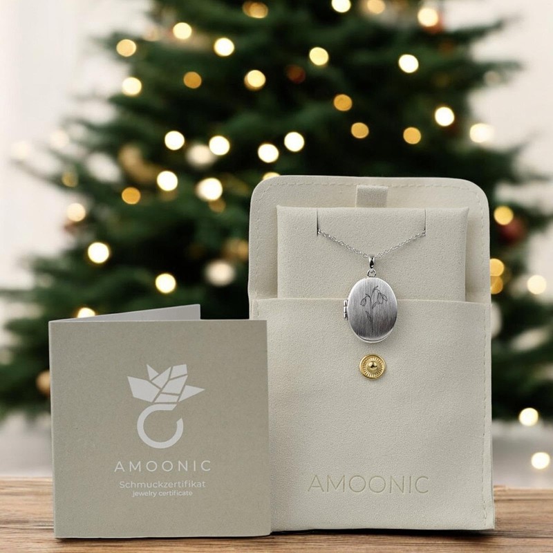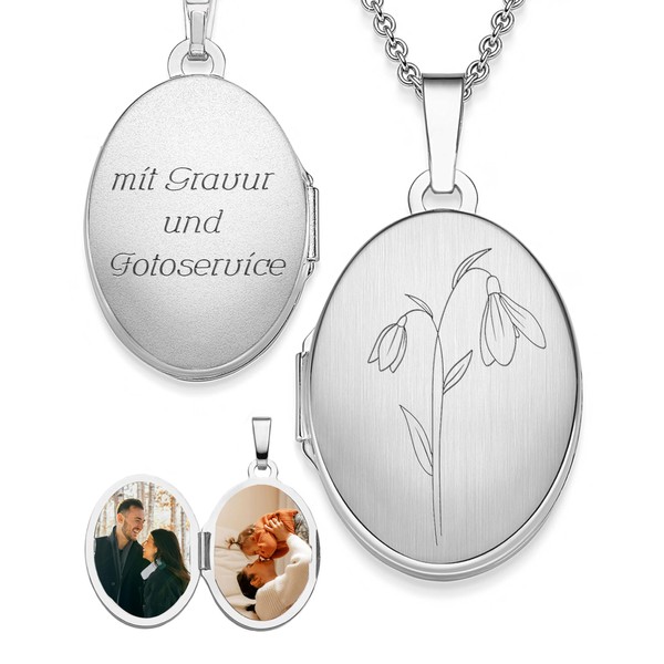 - Details: the oval locket by Amoonic is made of 925 silver. The chain length is variable from 45 cm - 50 cm. The hinged photo locket can be filled with 2 photos and engraved on the back with the desired birth flower.
