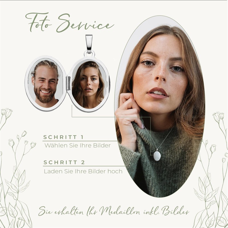 - Photo service: with the photo service you can upload the pictures directly and you will receive the locket ready to give as a gift including the pictures. Alternatively, you can easily insert the picture yourself using our included stencil at home.