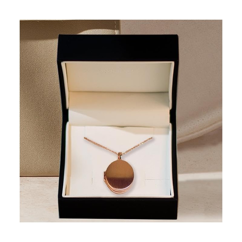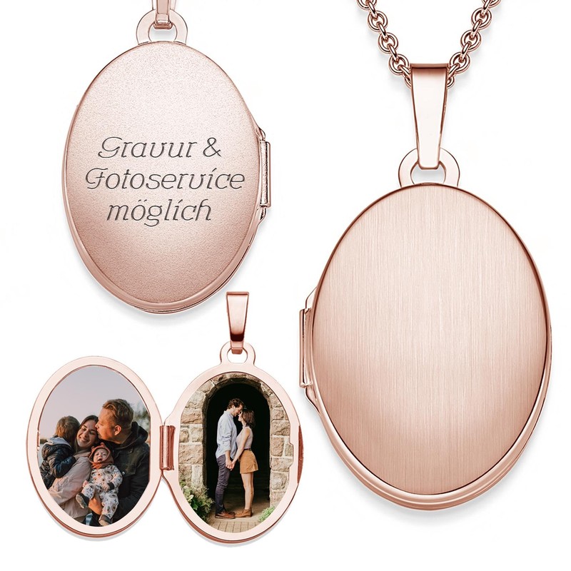 - Details: the oval locket by Amoonic is made of rose gold plated 925 silver. The chain length is variable from 45 cm - 50 cm. The hinged photo locket can be filled with 2 photos and can be engraved with your desired engraving.