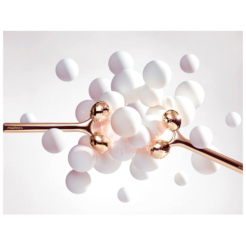 A rose gold plated massage roller for visibly lifting, sculpting and defining facial contours by providing physical stimulation.