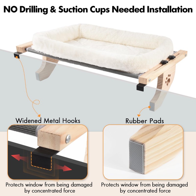 - No Drilling & Suction Cups Needer for Installation: This cat bed is fixed on the carrier by two metal hook and supported by two wooden supports, without the need to damage the wall and the worry of the suction cups falling off. The metal hooks are widened. The contact surface with the windowsill is larger that protects your window from being damaged by the concentrated force.