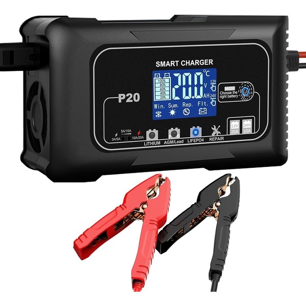 - 🚙 [Widely used] 12V 20Amp, 24V 10Amp ultra-high power, intelligent identification can be charged quickly, without damaging the battery. Automatic lock button after 10 seconds to prevent misoperation. Lithium, LifePO4, Lead acid (AGM/GEL/EFB, MF, Flooded battery, VRLA, SLA, wet battery..) For cars, trucks, motorcycles, SUVs, golf carts, farm vehicles, motorboats.. Lithium: 12.4V / 24.8V. Lead acid:14.7V / 29.4V. LifePO4:14.6V / 29.2V. Please select the correct type.