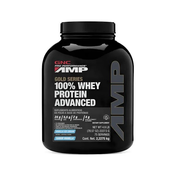 Amp Gold 100% Whey Protein Adv Van 4.9 Lbs es una proteína de suero de alta calidad, ideal para quienes buscan optimizar su rendimiento físico y mejorar la recuperación muscular. Con un delicioso sabor a vainilla, cada porción proporciona 24 g de proteína y 5.5 g de aminoácidos esenciales, fundamentales para el desarrollo y mantenimiento de la masa muscular. Este suplemento es bajo en grasas y carbohidratos, lo que lo convierte en una opción perfecta para quienes desean cuidar su dieta. Además, es fácil de mezclar en batidos o recetas, lo que facilita su incorporación en tu rutina diaria. Aunque contiene lactosa, es libre de gluten, lo que lo hace accesible para muchas personas. Recomendado para mayores de 18 años, este producto de GNC viene en un práctico formato en polvo y se presenta en un bote con características de conservación adecuadas. ¡Potencia tu entrenamiento con Amp Gold!