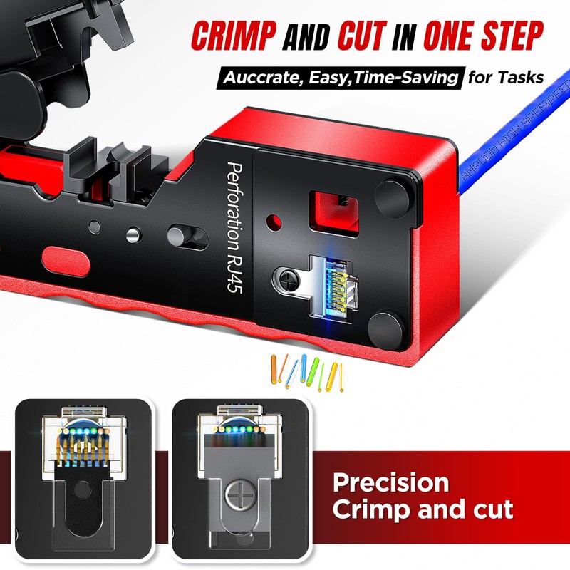 - High-Carbon Steel Precision Crimping Dies: Ensures precise terminations for Ethernet and telephone cables, providing stable connections for both stranded and solid cables