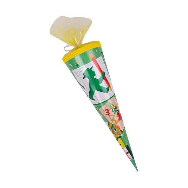 - The colourful sugar cone with yellow tulle closure and playful figures accompanies your little ones to the beginning of school.