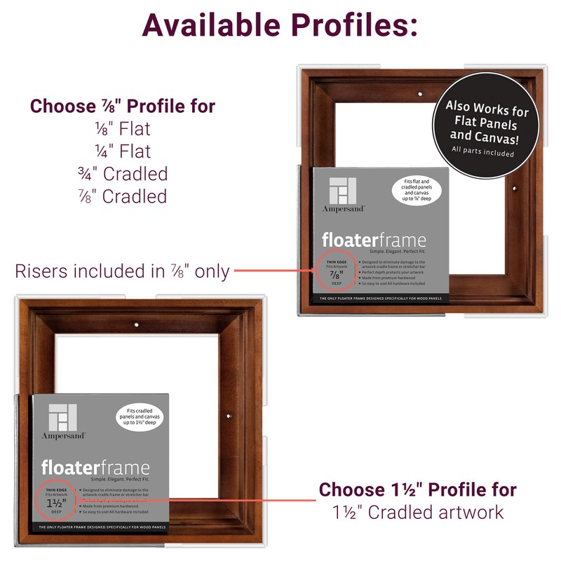 - EASY TO USE: All hardware is included! Each wood Floaterframe includes a hardware set complete with screws, hanging wire, bumper pads, hanging hook, and nail. Riser blocks are included with the 7/8" frame. An easy-to-use, DIY wood floating frame for canvas and panel paintings.