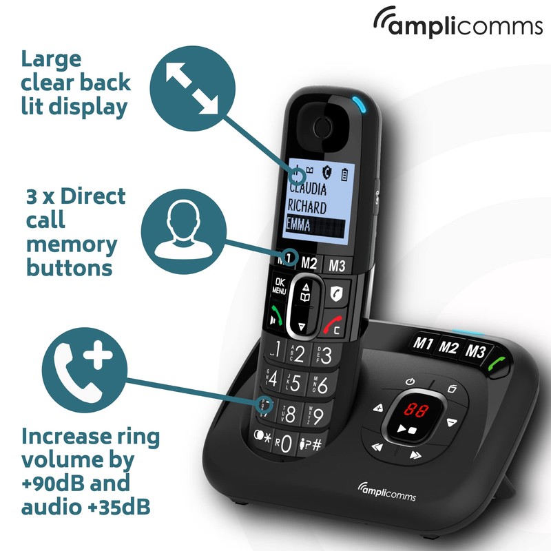 Amplicomms BigTel 1582 Cordless Big Button Phone for Elderly with Answer Machine Plus Additional Handset - Loud Phones for Hard of Hearing - Hearing Aid Compatible Phones - Cordless Number Telephone
