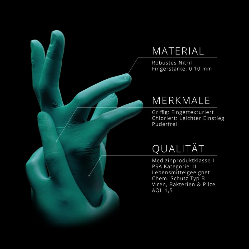 - Confirmed protection: the food-safe nitrile meets the standards EN 455 and EN 374. The examination gloves protect against viruses, bacteria and fungi, are approved as a medical device class I and are subject to the PPE cat. III.