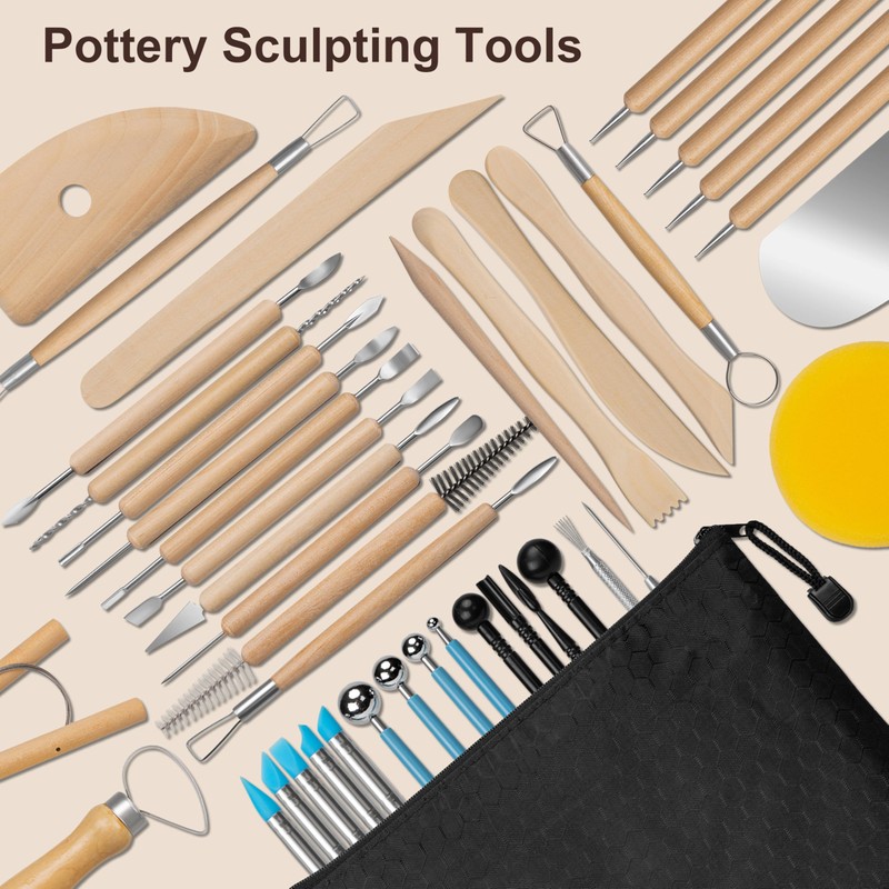 - 43 PCS CLAY SET: 20 wooden clay tools, 5 wooden handle ball stylus, 5 rubber pens, 4 rubber handle ball stylus, 4 plastic stylus, 2 metal needle tool, 1 metal rib,1 pottery sponge, packed in a zipper storage bag, easy to carry and store