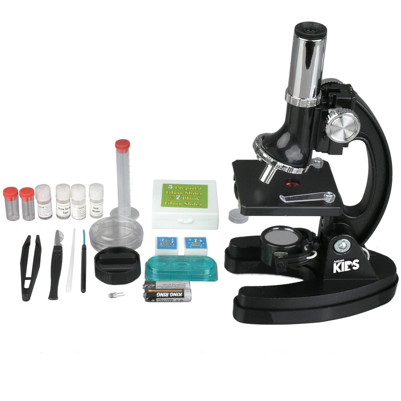 This science microscopy kit includes a great beginner level compound microscope equipped with advanced features and all the necessities of accessories. The microscope features six magnifications of 120X, 240X, 300X, 480X, 600X and 1200X, a single coaxial coarse focus knob, a specimen stage with two built-in stage clips, and a nature light and/or LED illumination system. It can be illuminated with either nature light through a mirror or by the built-in LED light that provides direct control of light. The microscope has a durable metal construction that makes it great value. The kit comes with sample slides, cover slips, tweezers, scalpel, specimen vials, adjustable lenses, collecting lamps plus a sturdy hard case for easy storage and travel. This set is good for beginning scientists.