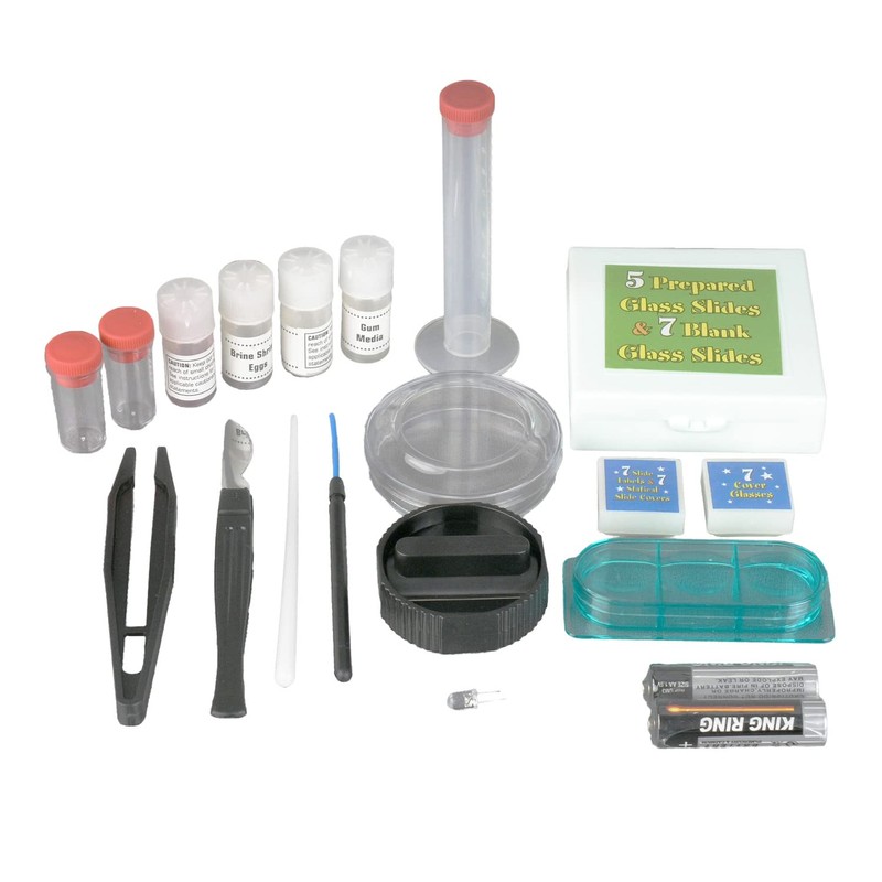 This science microscopy kit includes a great beginner level compound microscope equipped with advanced features and all the necessities of accessories. The microscope features six magnifications of 120X, 240X, 300X, 480X, 600X and 1200X, a single coaxial coarse focus knob, a specimen stage with two built-in stage clips, and a nature light and/or LED illumination system. It can be illuminated with either nature light through a mirror or by the built-in LED light that provides direct control of light. The microscope has a durable metal construction that makes it great value. The kit comes with sample slides, cover slips, tweezers, scalpel, specimen vials, adjustable lenses, collecting lamps plus a sturdy hard case for easy storage and travel. This set is good for beginning scientists.
