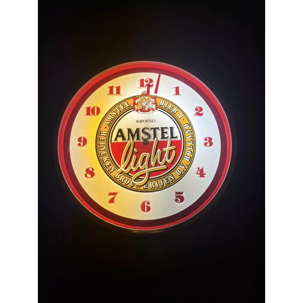 This vintage Amstel Light beer clock is a must-have for any breweriana or beer collector. The clock features the iconic Amstel logo and lights up for a unique display. It is brand new and comes in its original box. This clock would make a great addition to any bar, man cave, or game room. The clock is suitable for anyone who loves beer and wants to add a unique piece to their collection. The clock is made by an unknown manufacturer and has not been modified in any way. This collectible clock is sure to impress any beer enthusiast.