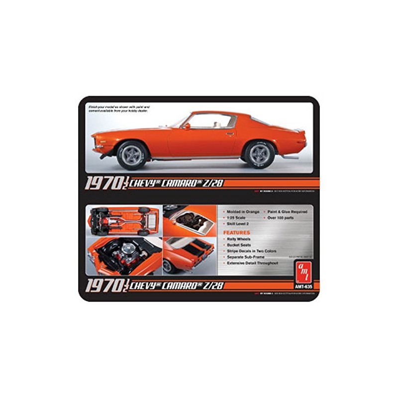 Product DescriptionRound 2 LLC., is an innovative collectibles company located in South Bend, Indiana.From the ManufacturerAMT presents 1970 1/2 Chevy Camaro Z/28 Model Kit - licensed by GM and Firestone. * 1:25 Scale * Molded in Orange *Authentic Details * Over 100 parts *Rally Wheels *Bucket Seats * Stripe Decals in 2 Colors * Separate Sub-Frame * Skill Level 2 *Paint, Glue Required