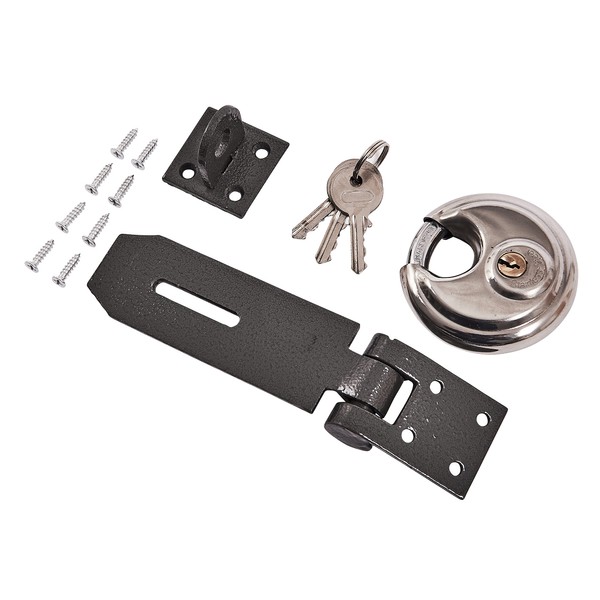 - DURABLE: This set includes a 70mm disc padlock and a heavy duty, heat treated carbon steel hasp and staple