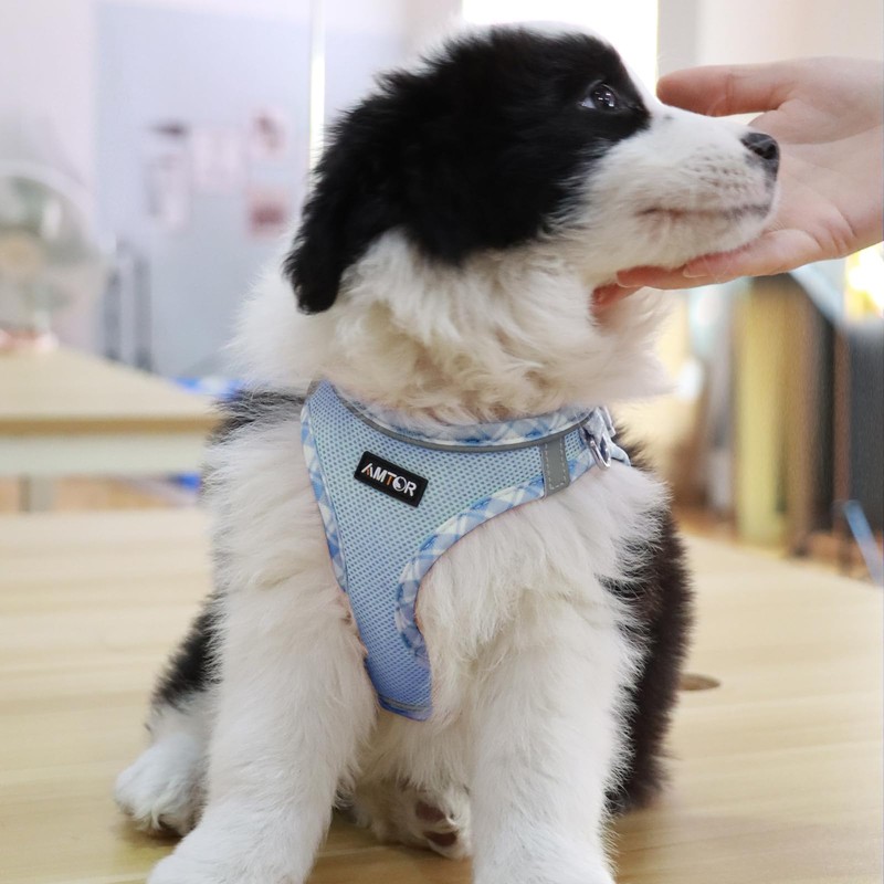 AMTOR Small Dog Harness with Leash Set, No Escape Easy Walk Puppy Harnesses for Training Walking, Step-in Reflective Soft Dogs Vest for XS S Medium Extra-Small Large Sized Dog(S Size,Blue/White)