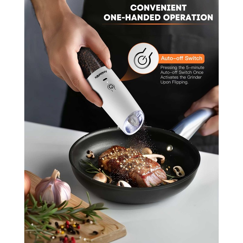 - AUTO-OFF SWITCH & CONVENIENT ONE-HANDED OPERATION - The salt or pepper mill is gravity activated, just press the 5-minute Auto-off Switch Once, then simply turn upside down and get fresh ground salt or pepper till your heart is content. No twisting! The white LED light will turn on automatically when the grinder is in operation.