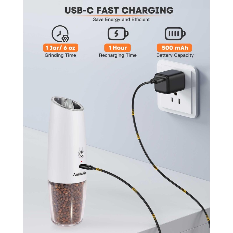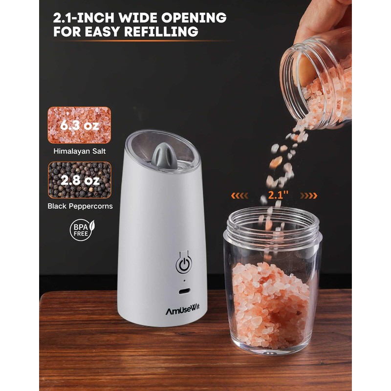 AmuseWit Gravity Electric Salt and Pepper Grinder Set [White Light] USB Rechargeable Automatic Pepper and Salt Mills,Adjustable Coarseness,One-Handed Operation, Snow White