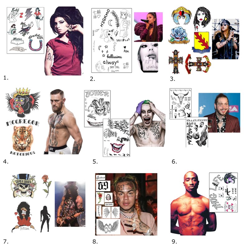 - A very realistic, life-size collection of Amy Winehouse's tattoos. Couple with our de-shine Gel for a brilliant, believable celeb effect.