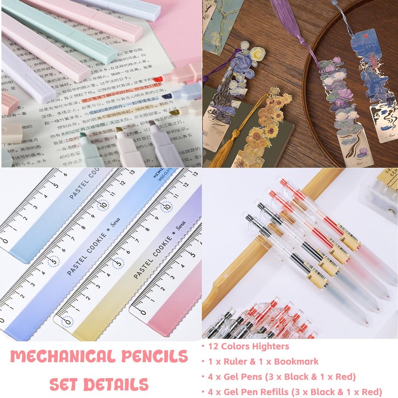 - 【All-in-one School Stationery Set】: Our comprehensive school supplies set includes: 1 pencil pouch, 12 colors pastel highlighters, 6 drafting mechanical pencils(0.5m*3 & 0.7mm*3), 6 tubes of lead refills(0.5mm*3 & 0.7mm *3), 4 gel pens(black*3, red*1), 4 gel pen refills(black*3, red*1), 3 jelly erasers, 1 ruler, 1 bookmark. 36-piece set meets all your needs of study and office