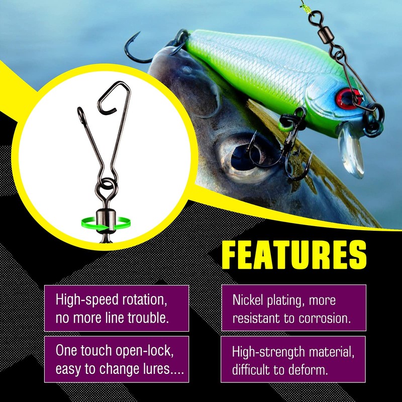 - Rolling Fishing Swivel High Speed Rotation: The fishing snaps are made by high quality steel material.The surface of the snap swivel is nickel polished,it would be corrosion resistance and abrasion resistance for satisfy your different usages.You can use it both in saltwater and freshwater. It will make sure under high pressure from line or lure,corrosion resistance, rust resistance, abrasion resistance, high strength and durability.