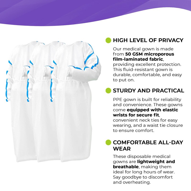 - High Level of Privacy. Pack of 1 3X-Large-sized medical gowns is made from 50 GSM microporous film-laminated fabric, providing excellent protection. This fluid-resistant gown is durable, comfortable, and easy to put on.