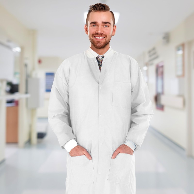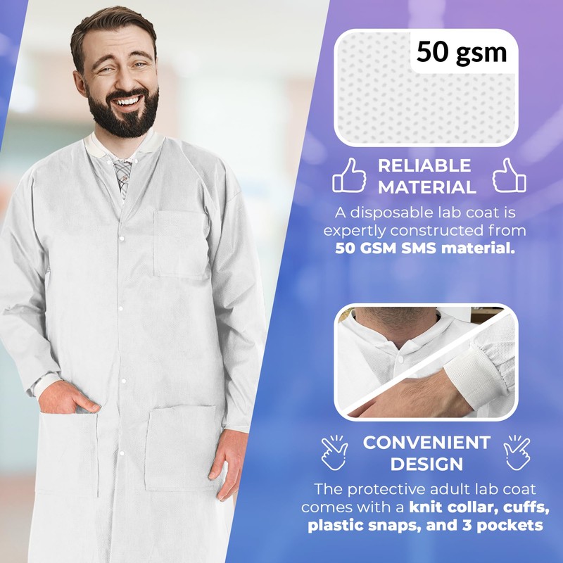 - Pack of 10 White Disposable Lab Coats. The adult lab coat is engineered for comfort and durability. The protective adult lab coat comes with a knit collar, cuffs, plastic snaps, and 3 pockets for added convenience and functionality.