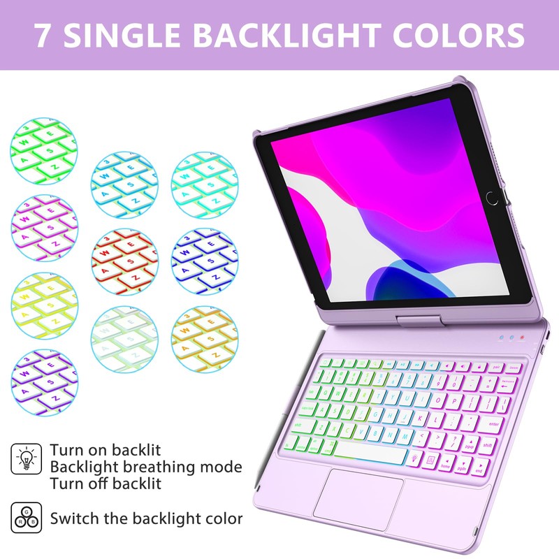 aMZCaSE Touch Keyboard Case for iPad 9th Generation (10.2", 2021), 10 Color Backlight, 360 Slim Cover, Bluetooth Keyboard with Pencil Holder, Compatible with iPad 8th Gen 2020, 7th Gen 2019, Light Purple