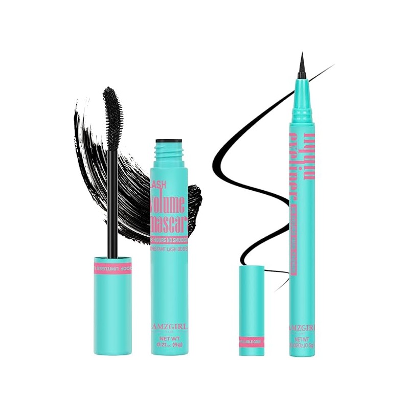 AMZGIRL LASH Black Mascara and Liquid Eyeliner Set, Waterproof Black Eye Makeup Set - Enhance Your Gaze with Natural Lasting Lift & Curl for Lashes and Pigmented Smudge-Proof Eye Liner