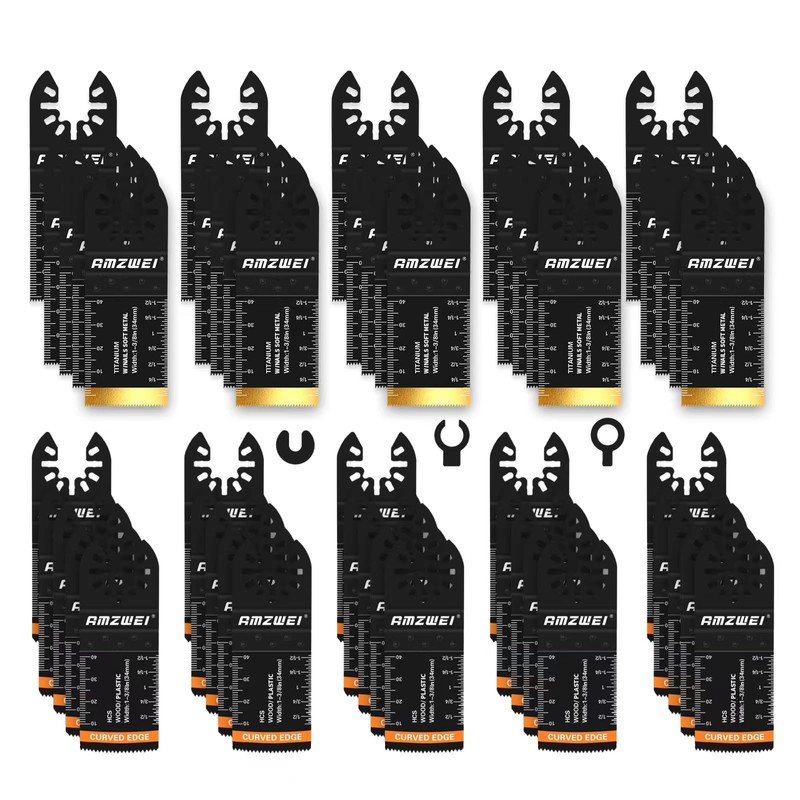 AMZWEI 50PCS Multi Tool Blade Kits, Professional Titanium Oscillating Tool Blades for Metal, Wood, Plastic, Curved Edge Oscillating Saw Blades Compatible with Dewalt Milwaukee Ryobi Rockwell Fein