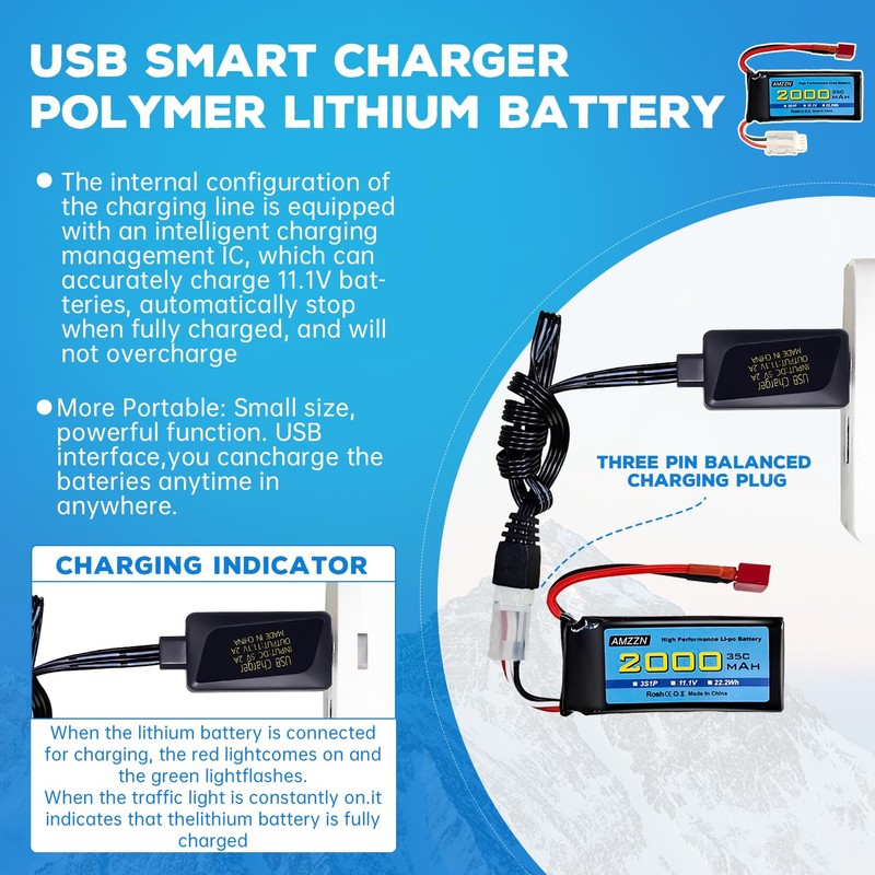 AMZZN 3S Lipo Battery 11.1V 2000mAh 35C with T-Plug for RC Cars,Trucks,RC Ships,RC Drones,Quadcopters,FPV UAV Batteries (2PCS Battery+2 USB)