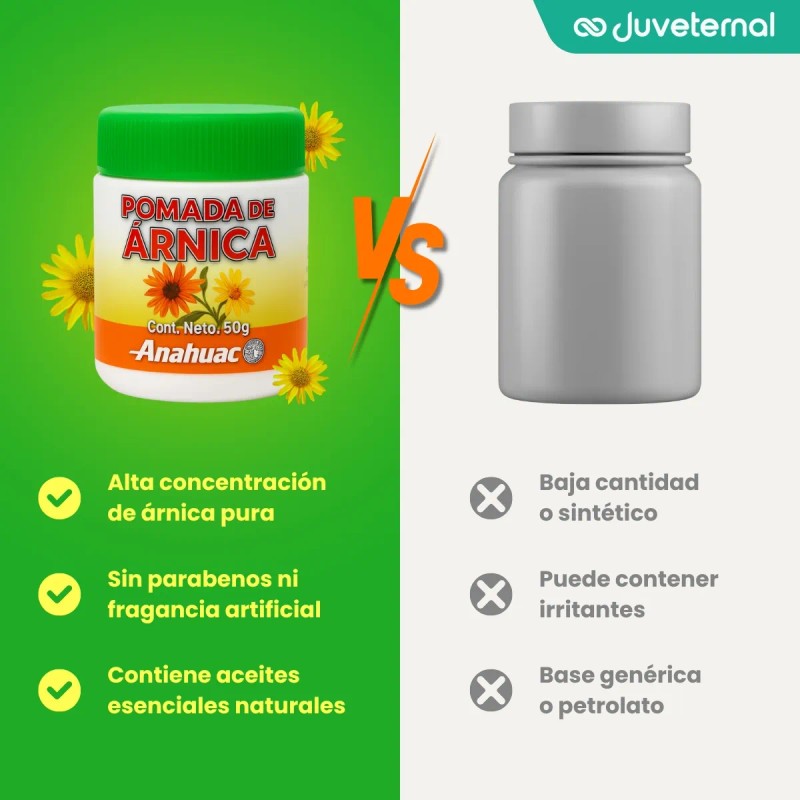¡Descubre el poder de la tradición herbolaria en un ungüento de acción rápida! 💚 La Pomada ANÁHUAC, en su práctico frasco de 50g, es una fórmula magistral que combina tres ingredientes clásicos y efectivos: Árnica, Alcanfor y Guayacol. Diseñada para brindar un alivio inmediato y profundo, es tu solución ideal para calmar el dolor, la inflamación y la rigidez causados por golpes, moretones, tensiones musculares, dolores articulares y el cansancio físico.