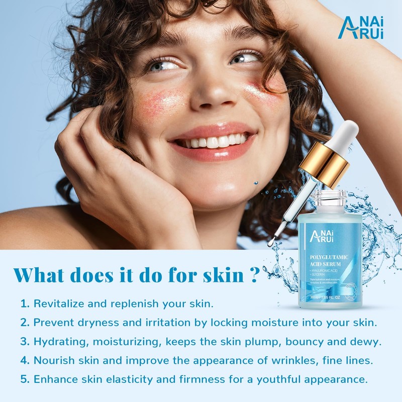 - SKINCARE ISSUE: Our polyglutamic acid serum has hydrating and firming effects. It effectively addresses skin problems such as dryness, roughness, redness, aging, dark circles, wrinkles, and fine lines, significantly improving skin roughness and leaving it soft, supple, and non-greasy.